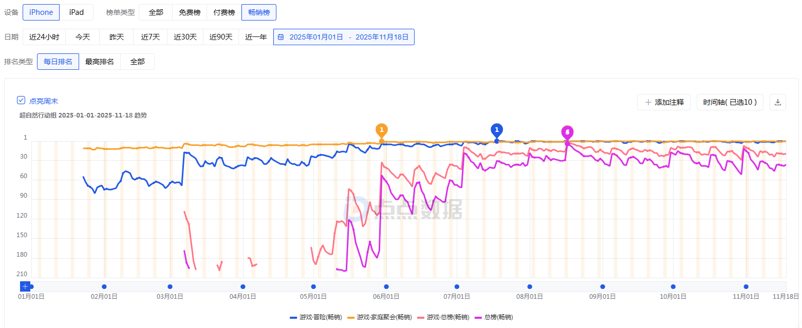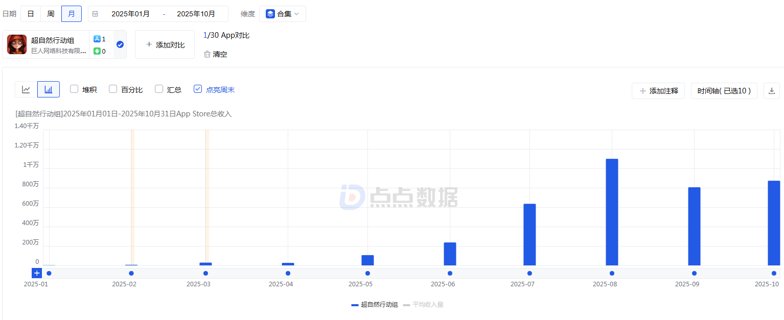 点点数据监测显示,《超自然行动组》上线以来“低开高走”。该游戏2025年7月同时在线人数突破100 万,8月中国内地iOS游戏畅销榜排名最高达到第4。