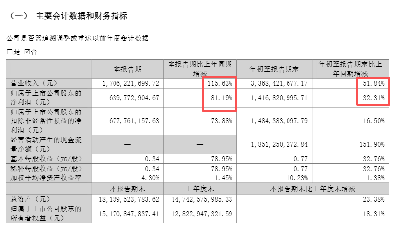 2025年第三季度,公司收入、归母净利润分别为17.06亿元、6.4亿元,同比分别增长115.63%、81.19%。